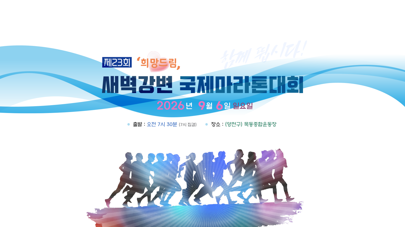"희망드림" 제23회 새벽강변 국제마라톤대회 대회일시 2026년 9월 6일 (일요일) 07:30 출발 (07:00 집결) 대회장소 (양천구) 목동종합운동장 참가부문 하프코스 , 10km코스 , 5km코스, 3km 가족런 접수기간 2026년 5월 12일 부터 ~ 선착순 5,000명 - 인원 충원시 조기마감 대회요강안내 참가신청안내